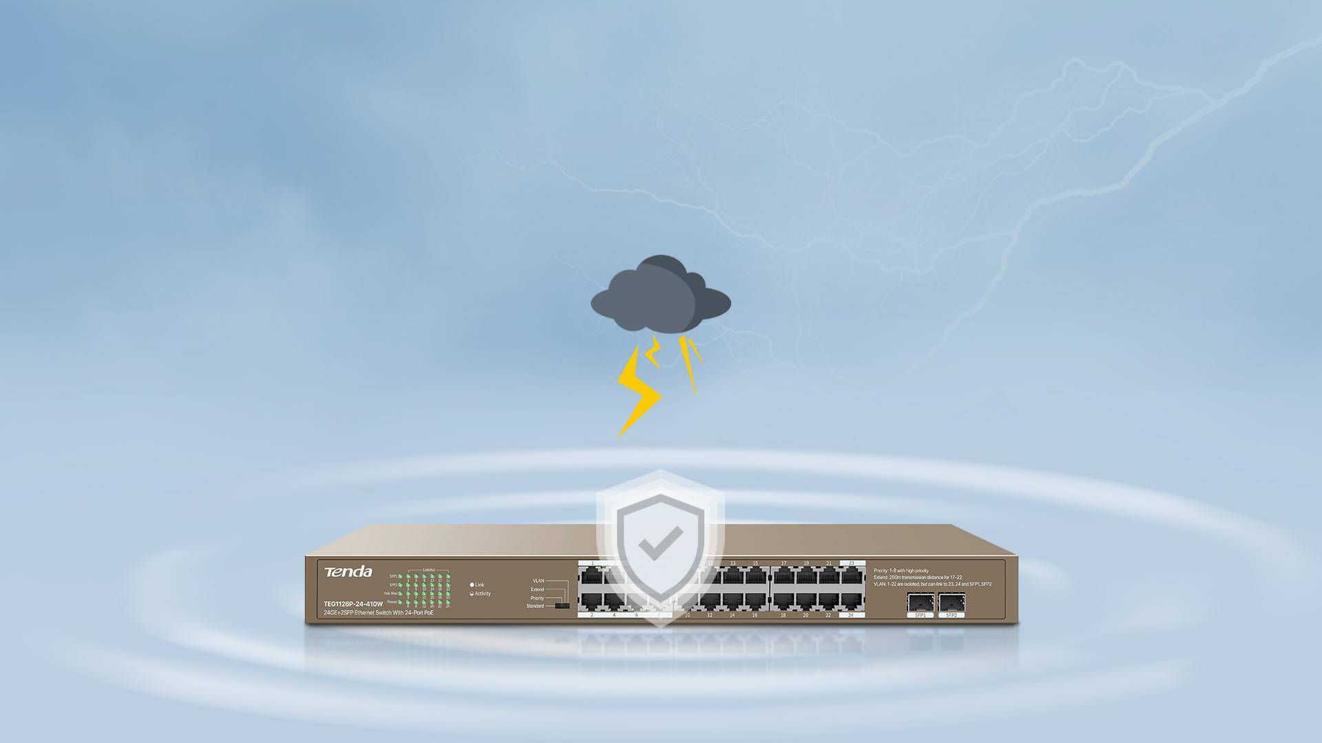 سوئیچ TEG1126P-24-410W یک سوئیچ PoE مدیریت نشده است که به طور مستقل توسط Tenda طراحی شده است. مطابق با استانداردهای IEEE 802.3af و IEEE 802.3at، می تواند دستگاه های مجهز به PoE را به صورت هوشمند شناسایی کند. با حداکثر توان خروجی PoE 370 وات و 30 وات برای یک پورت، می‌تواند هنگام انتقال داده‌ها با اکسس پوینت، دوربین‌های IP و تلفن‌های IP، برق را تامین کند.