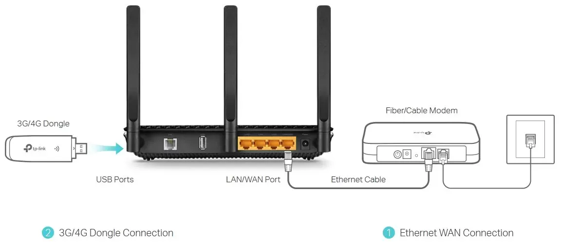Archer VR600 برای اتصال شما به اینترنت بدون توجه به موقعیت شما ساخته شده است. پورت WAN اترنت از اتصال سیمی به مودم کابلی یا فیبری پشتیبانی می کند و به شما این امکان را می دهد تا به عنوان روتر، شارژ کامل قابلیت های بی سیم آن را بر عهده بگیرید. در صورتی که اینترنت شما قطع شود، یک آداپتور 3/4G را به پورت USB 3.0 وصل کنید تا به عنوان یک گزینه پشتیبان عمل کند تا بتوانید در کمترین زمان آنلاین شوید.