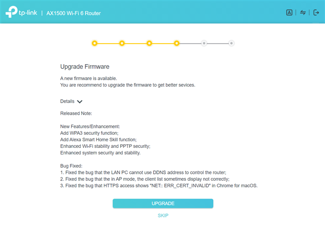 سپس، روتر بررسی می کند که آیا اتصال اینترنت شما کار می کند و آیا می تواند از آن استفاده کند یا خیر. اگر همه چیز خوب است، به شما توصیه می کند که سیستم عامل را به آخرین نسخه ارتقا دهید.